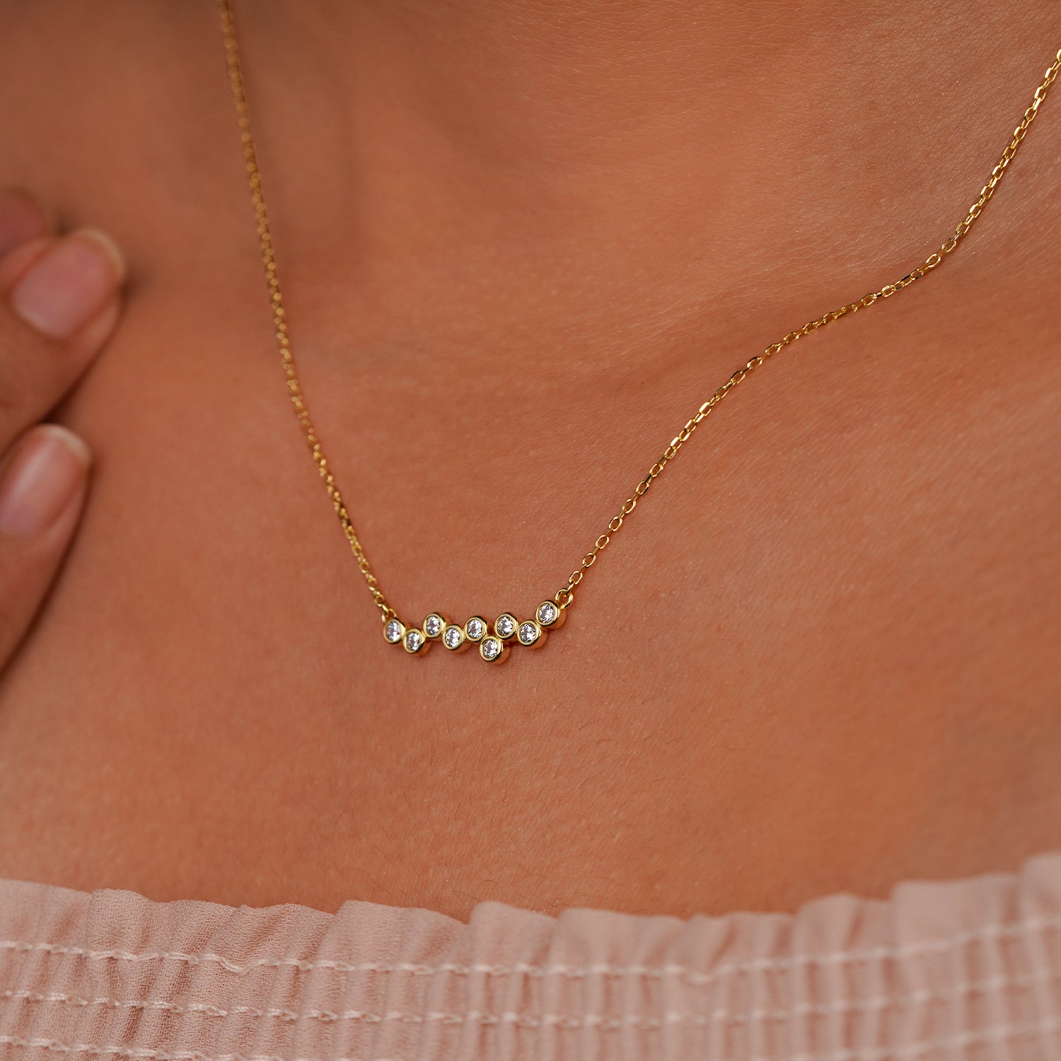 The Aurielle Curve Diamond Necklace features a graceful arc of sparkling diamonds set on a fine gold-toned chain, creating a timeless and elegant silhouette. Designed for everyday luxury, this minimalist diamond necklace adds subtle brilliance to both casual and formal looks. Perfect for layering or wearing solo, it’s an ideal choice for modern women who love refined, delicate jewelry. A beautiful gift for anniversaries, birthdays, or special occasions.