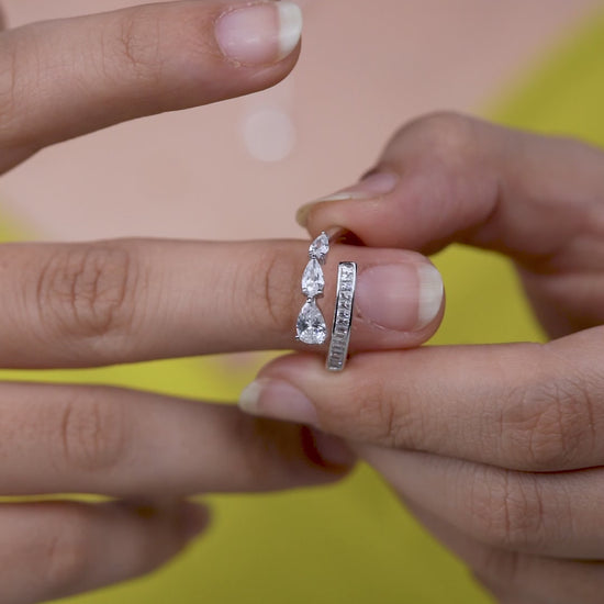 Elegant and contemporary, the Aurora Curve Ring features a unique open-band design adorned with three brilliant pear-shaped stones on one end and a row of channel-set baguette diamonds on the other.