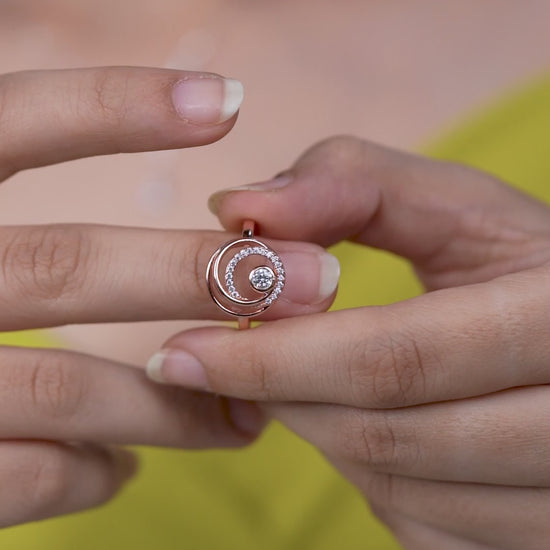 Unleash your inner glow with the Aurora Rose Spiral Ring—a bold blend of elegance and artistry. Crafted in luxurious rose gold, this eye-catching design features a swirling spiral motif encrusted with brilliant white stones, centered around a bezel-set round-cut gem.