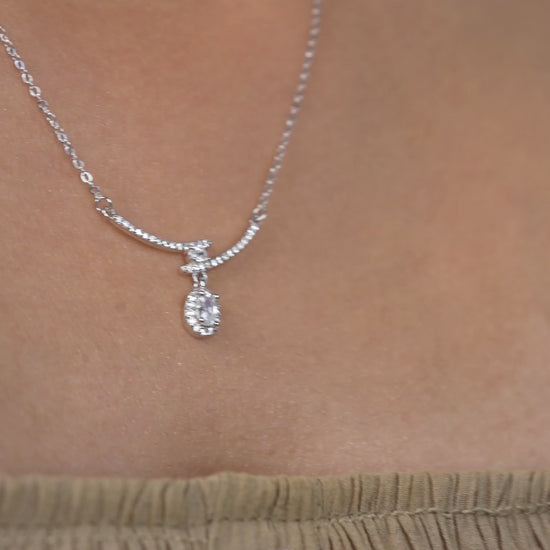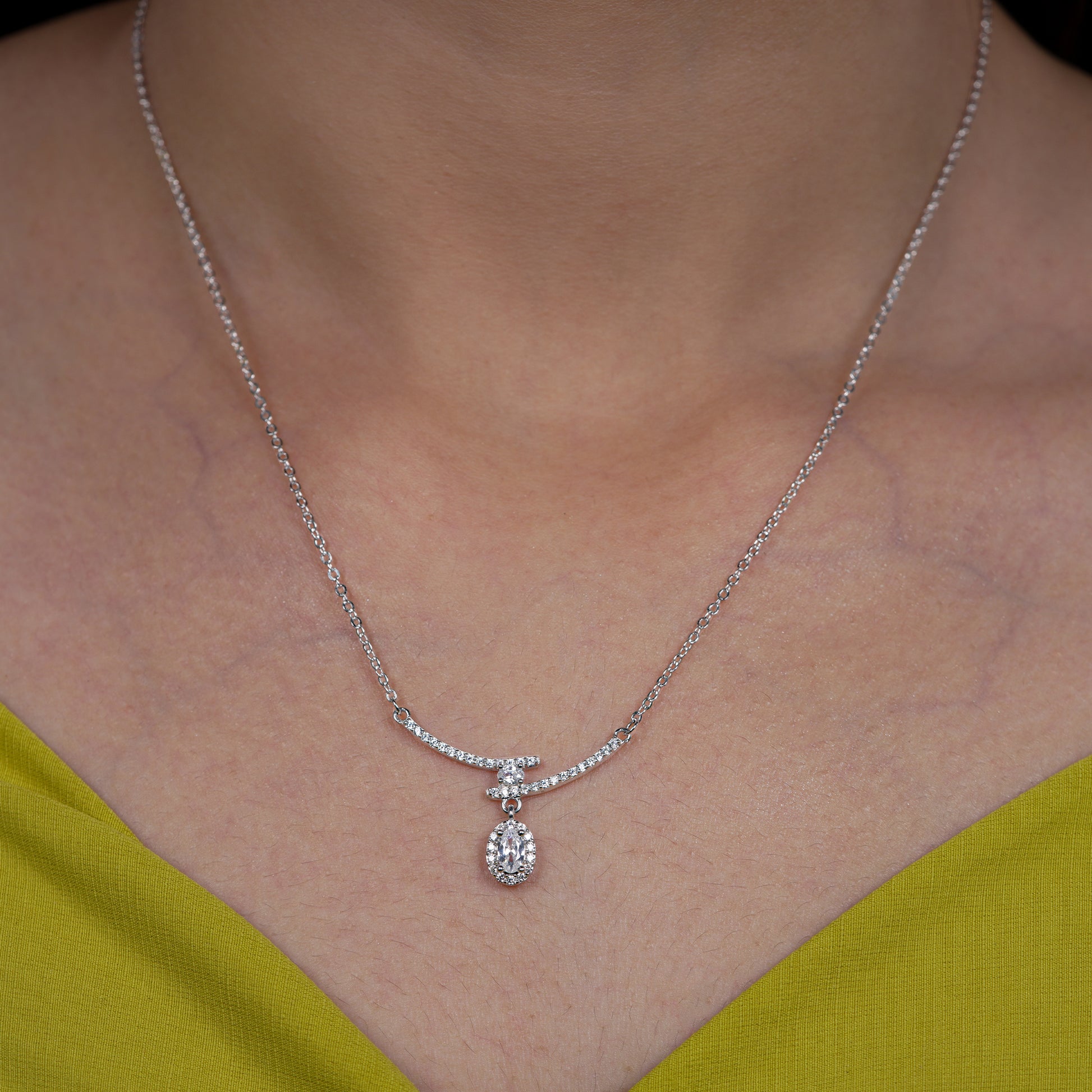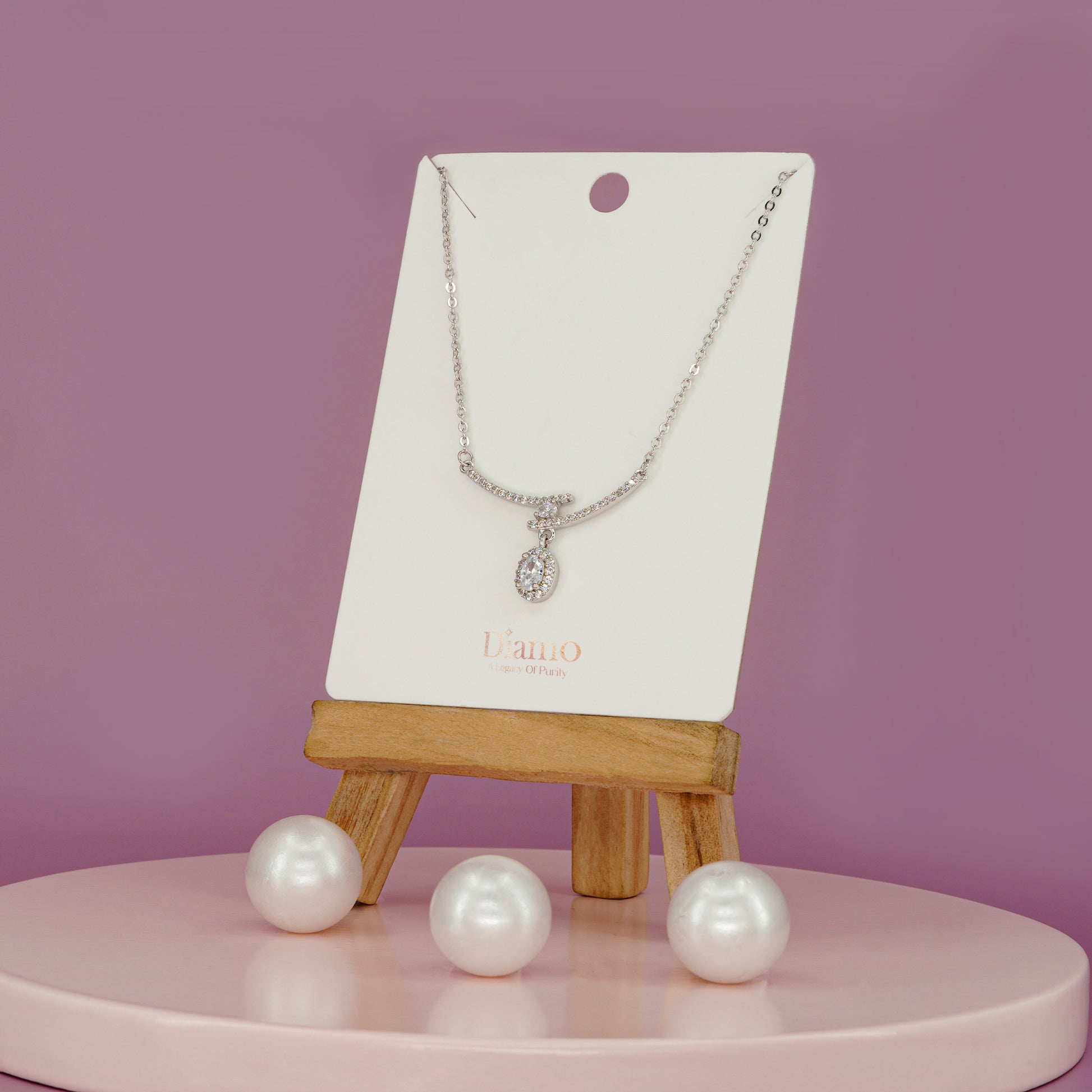 Exude timeless charm with the Celestial Grace Necklace, featuring a dazzling teardrop centerpiece encircled by a halo of radiant stones. Its sleek, stone-studded arc seamlessly blends into a delicate chain, creating an elegant drape across the neckline. Ideal for both evening elegance and everyday glamour.