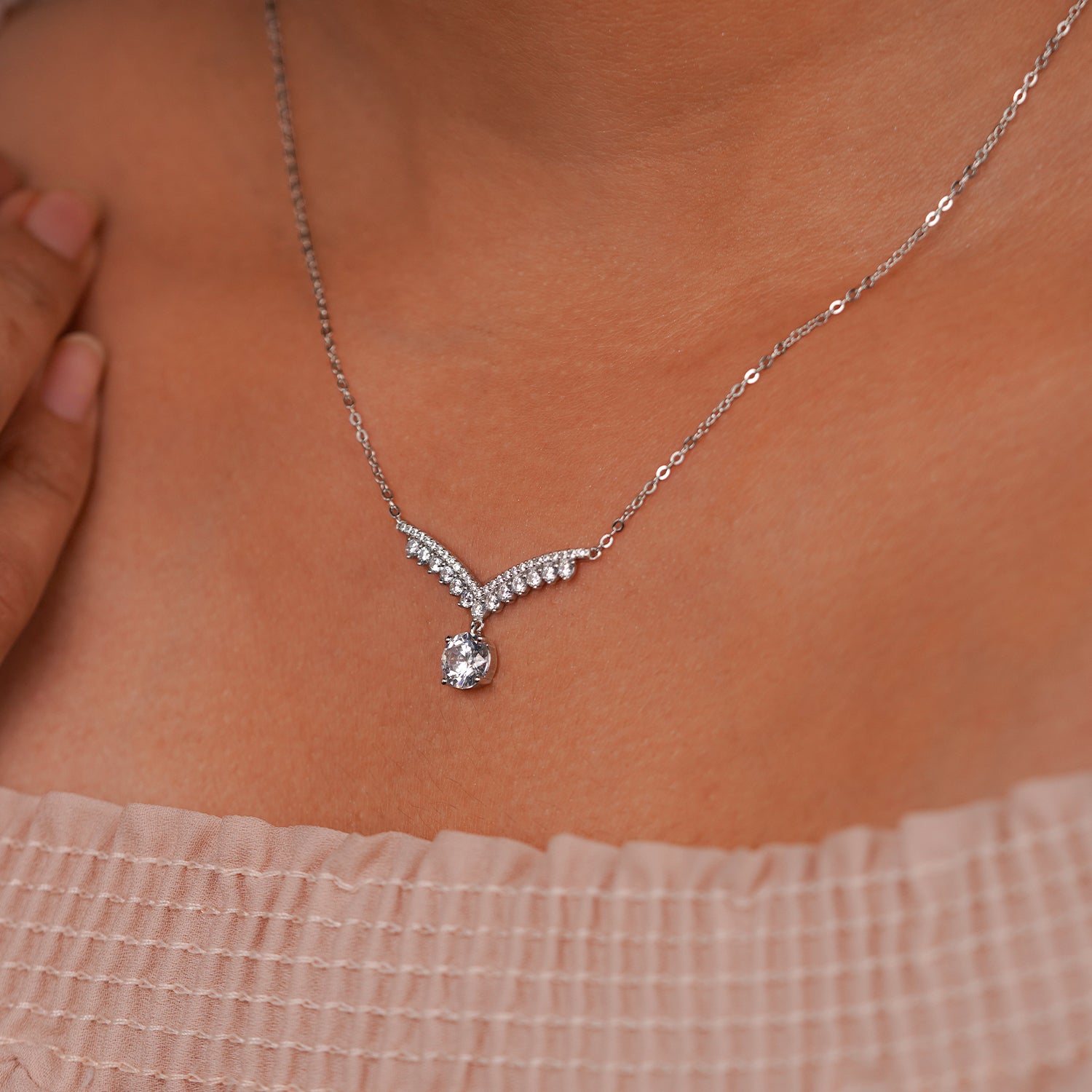 Grace your neckline with the timeless charm of the Celestial Wing Diamond Drop Necklace, designed to reflect elegance in motion. Featuring a delicate wing-inspired curve adorned with sparkling round diamonds and finished with a radiant dangling solitaire, this necklace offers a perfect balance of sophistication and brilliance. Crafted on a fine, sleek chain, it complements both everyday outfits and special occasions effortlessly. Ideal for gifting, celebrations, and modern bridal looks, this diamond drop necklace is perfect for searches like diamond pendant necklace, minimal diamond jewelry, and elegant daily wear necklace. A refined piece that adds subtle luxury to every moment.