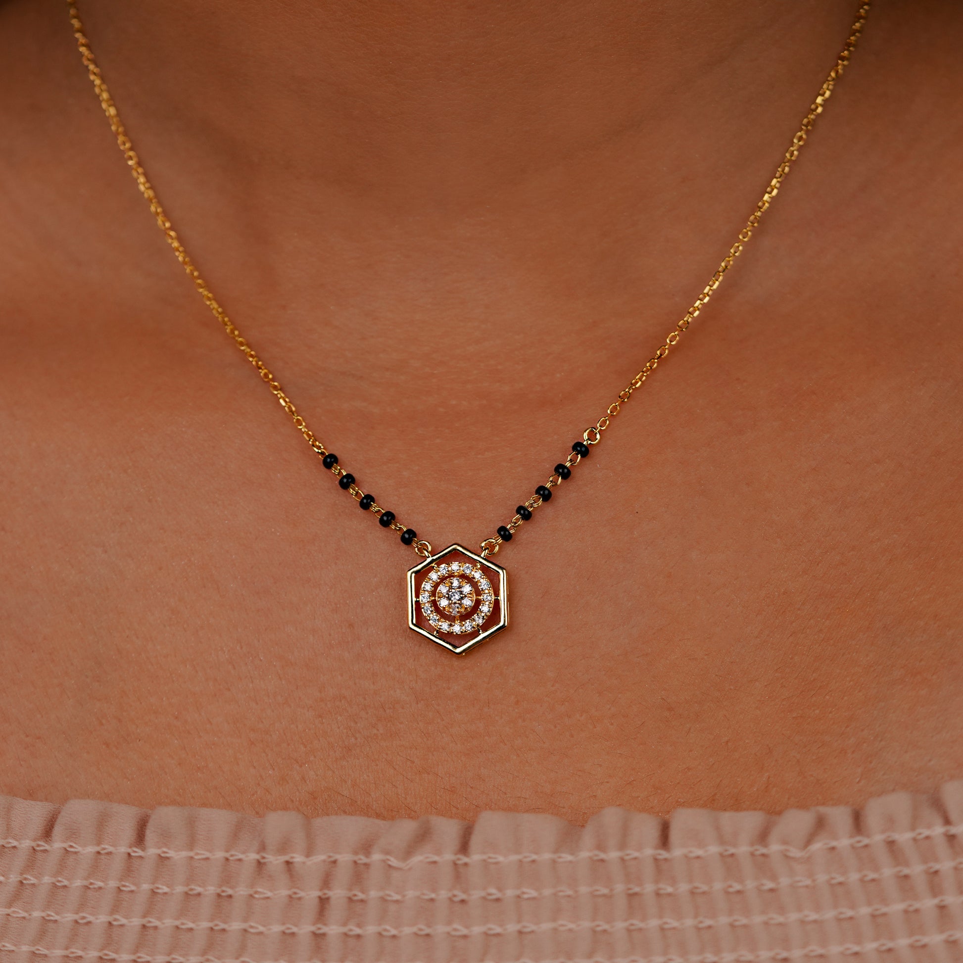 Step into elegance with this circular bloom 925 silver mangalsutra, designed with a stunning round centerpiece highlighted by shimmering stones. The layered circular motif symbolizes harmony and wholeness, while the traditional black bead accents add timeless charm. Crafted from premium sterling silver with a glossy rose-gold finish, this lightweight mangalsutra is perfect for both daily wear and festive occasions. A graceful blend of tradition and modern design, it makes a meaningful addition to every woman’s jewelry collection.
