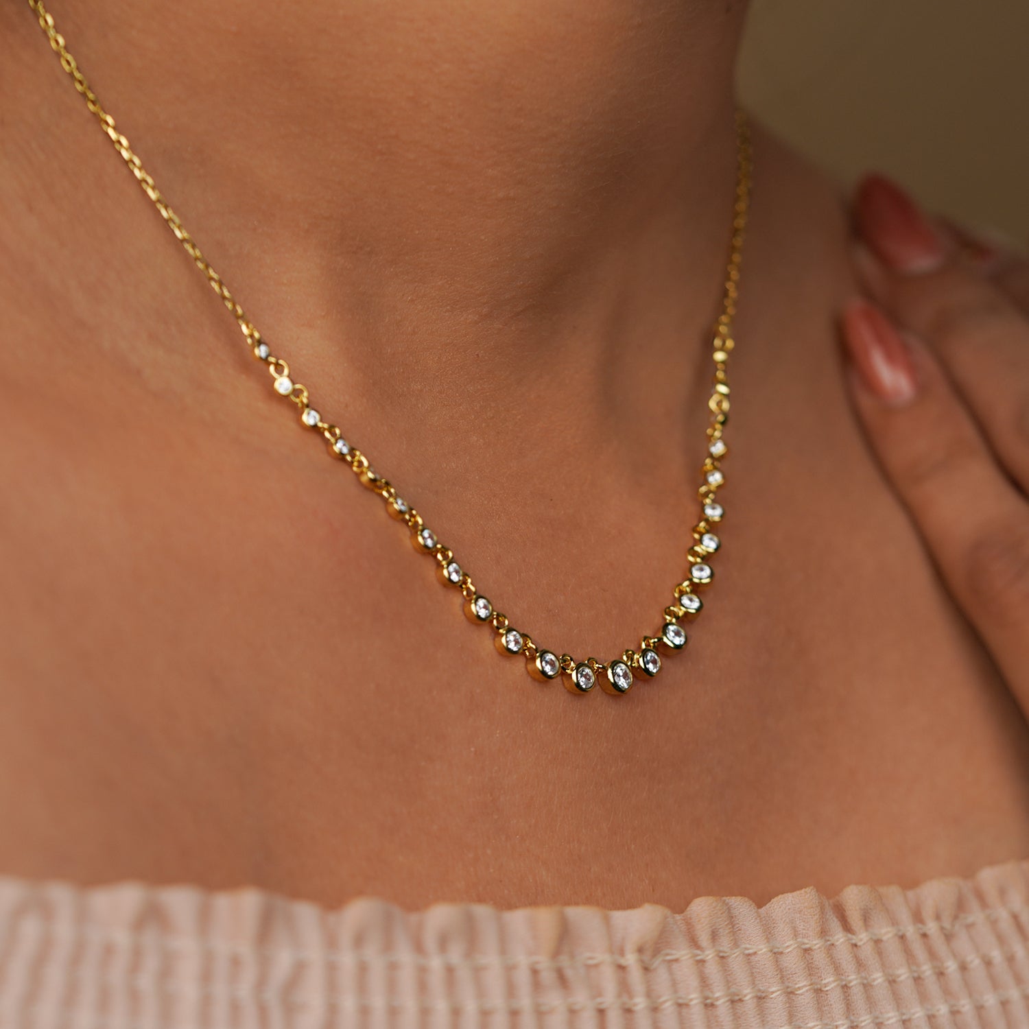 Elevate your everyday style with the Classic Aurora Bezel Set Necklace. Designed with a sleek gold-tone chain, this necklace features a graceful row of sparkling bezel-set stones that create a refined and sophisticated look. Lightweight, elegant, and versatile, it pairs beautifully with ethnic, western, and office wear. Perfect for special occasions, celebrations, or daily styling, this timeless women’s necklace adds a subtle yet luxurious shine to any outfit — a must-have jewellery piece for modern, minimalist fashion lovers.