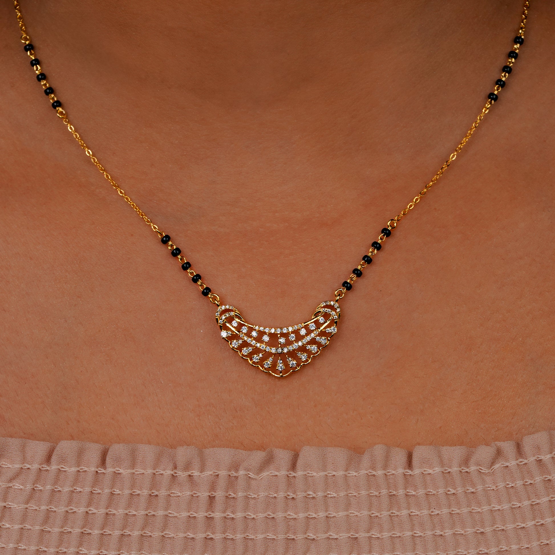 Radiate elegance with this golden shine 925 silver mangalsutra, designed with a unique scalloped arc motif beautifully encrusted with sparkling stones. The golden finish enhances the brilliance of the sterling silver base, while the traditional black beads add timeless charm. Perfectly balancing tradition with a modern look, this lightweight mangalsutra is ideal for everyday elegance as well as festive celebrations. A meaningful piece of jewelry, it symbolizes love, unity, and everlasting style.