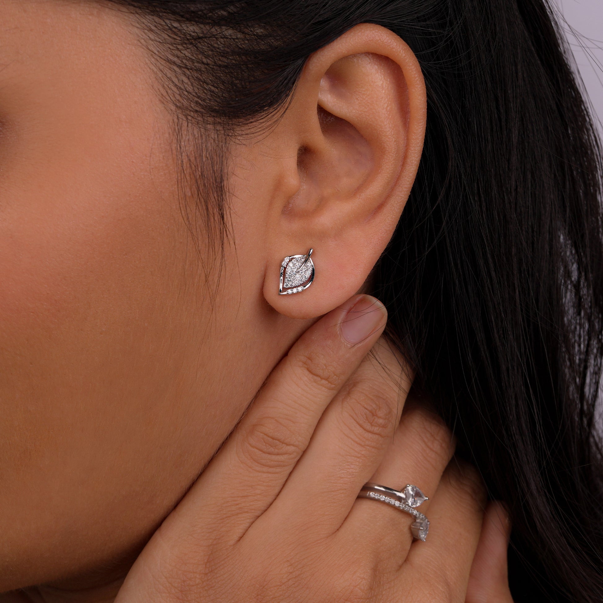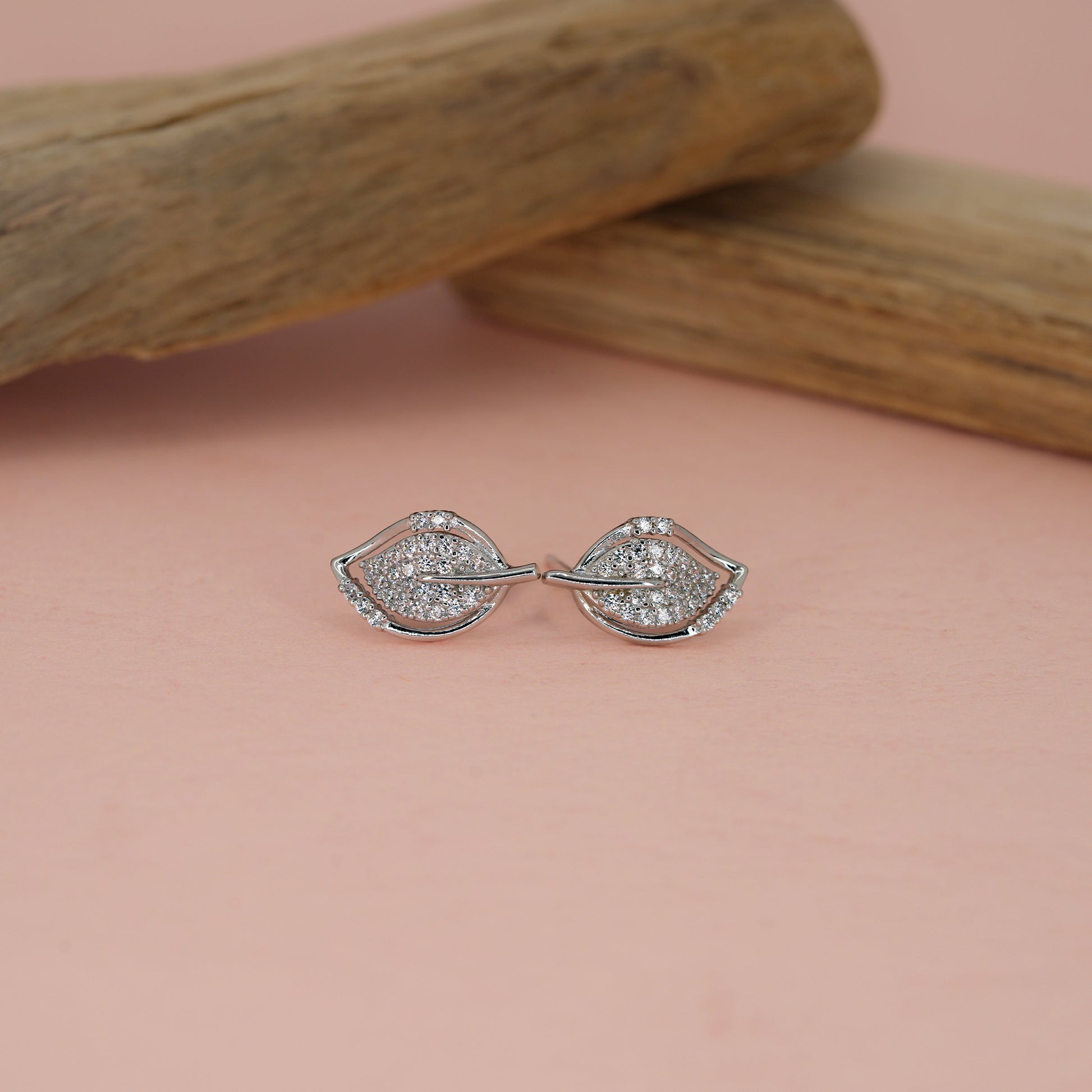 Embrace the elegance of nature with our Leaf Whisper Diamond-Cut Stud Earrings, meticulously crafted in a sleek silver-tone finish. Featuring a graceful leaf-shaped design encrusted with dazzling diamond-cut cubic zirconia stones, these studs blend botanical beauty with modern sophistication.