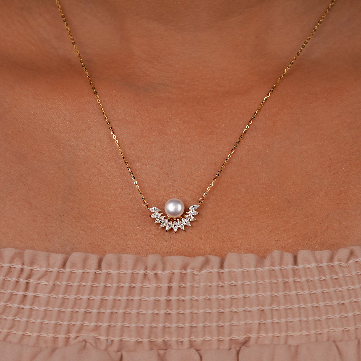 Elevate your elegance with our Radiant Crest Pearl & Diamond Necklace, designed to bring a luxurious sparkle to any look. Featuring a luminous round pearl set atop a stunning fan-shaped arrangement of marquise-cut diamonds, this necklace exudes royalty and refinement. Its golden chain adds a warm, classic touch, making it perfect for festive occasions, weddings, office wear, or thoughtful gifting. Ideal for women who appreciate premium fine jewelry, this pearl and diamond necklace blends modern sophistication with timeless charm. A standout accessory that enhances both everyday and special-occasion outfits.