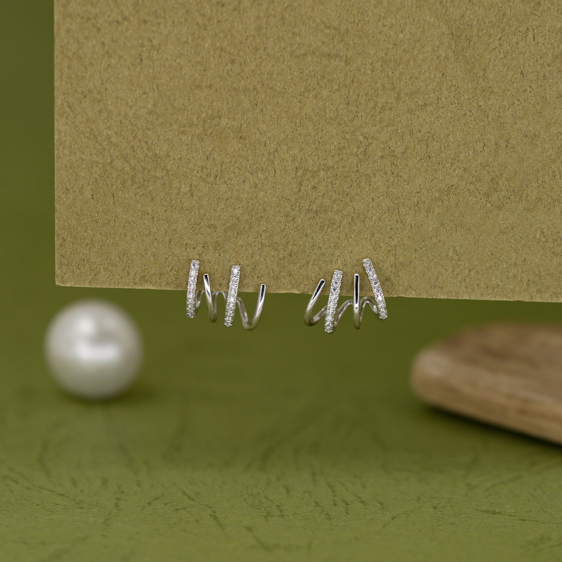 Make a bold yet minimalistic statement with our Triple Twist Diamond Hug Earrings. Crafted to mimic the illusion of three sleek hoops in one, these contemporary ear-hugging studs feature shimmering pavé diamonds aligned across a triple-row wave design.